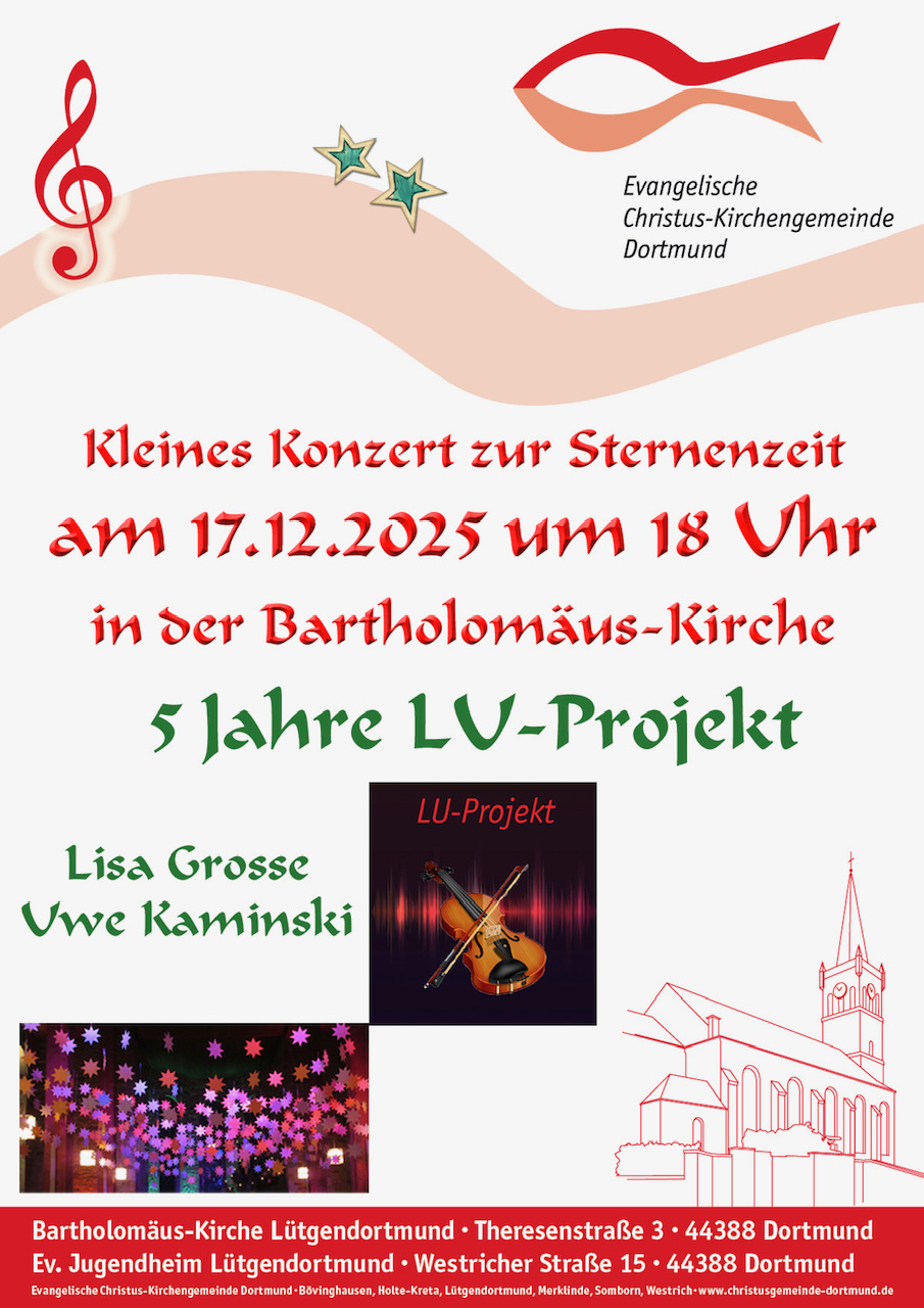 Wieder ist es soweit, das LU - Projekt lädt am 17.12 2025 zum kleinen Konzert zur Sternenzeit um 18 Uhr in die Bartholomäuskirche in Dortmund Lütgendortmund ein. Der Eintritt bleibt frei.